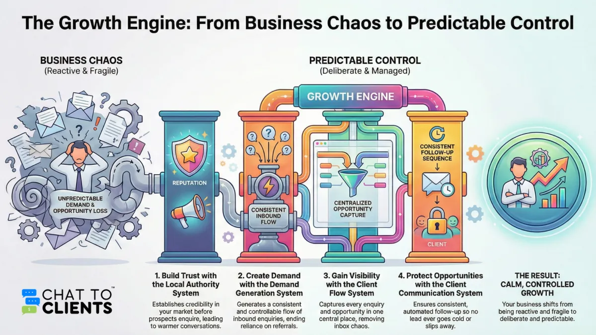 But successful companies aren't built in weeks. They're built over decades by leaders who lock in a system and let it compound. The Growth Engine isn't a quick fix. It's the operating infrastructure that turns your business into an asset—predictable, scalable, and no longer dependent on you holding it all together. Commit to the system today, and imagine where you'll be in five years: more revenue, more freedom, and a business that works without you.